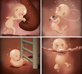 C’était chouette d’être dans le ventre de maman. D’abord c’est confortable et puis ça permet de goûter plein de choses. J’ai même mangé de la cuisine turque, indienne et asiatique. Mais c’est normal, papa dit toujours que c’est sa famille qui a inventé la cuisine taille.